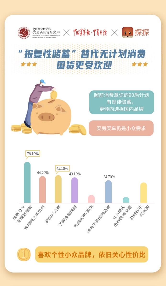 数据显示,与报复性消费相比,“报复性储蓄”显然更是群体的共识,78.1%的年轻人会选择有规律储蓄,45.1%的人倾向选择国内品牌,44.2%的人会在网上抢购物优惠券,但仅有11.1%的人考虑买房买车。