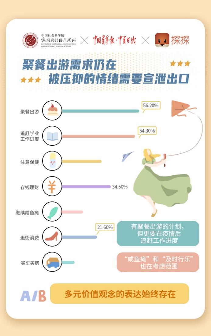 而在“疫情平稳后,你最想做的事”这一问题里,我们更能窥见时下年轻人的喜乐哀愁。有56.2%的年轻人期待疫情后的聚餐出游计划,被压抑的情绪需要宣泄出口;同时,54.3%的人表示要在疫情后追赶工作进度,而34.2%的90后选择及时行乐,12.10%的人会继续“闲鱼”躺,多元价值观念的表达始终存在。