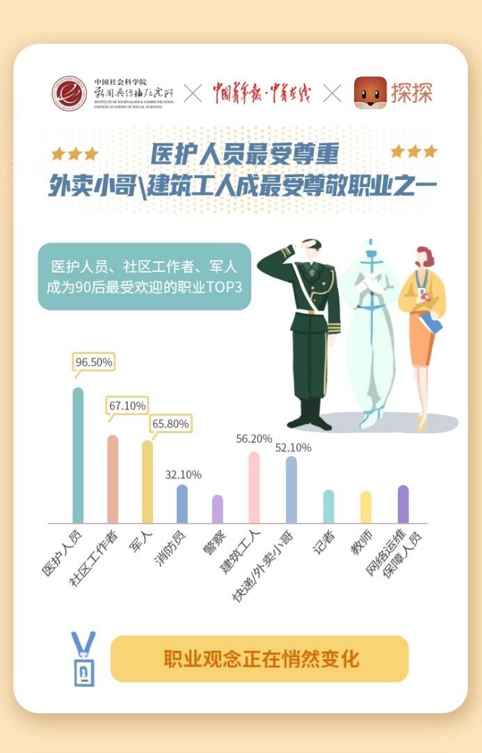 历经疫情,年轻群体的职业观念也发生了明显变化,医护人员、军人、社区工作者成为90后最受欢迎的职业TOP3,建筑工人、外卖小哥成为最受年轻人尊敬的职业之一。