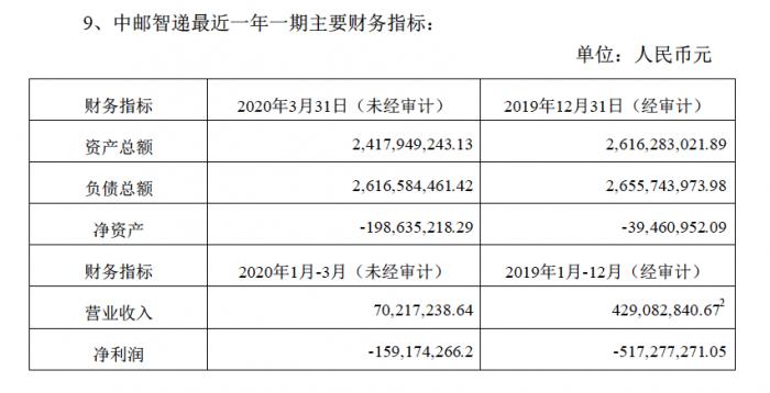 中邮智递2020年1月至3月未经审计营收7021万元,未经审计净利润亏损约1.59亿元,而2019年营收4.29亿元(其中,广告业务收入0.63亿元,快递柜业务收入3.66亿元),亏损约5.17亿元。