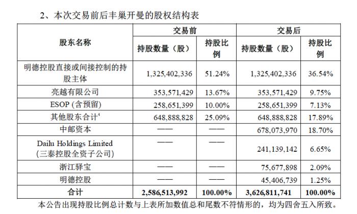 至上述交易前,中邮智递的股权结构为:中邮资本持股50%,三泰控股持股34%,浙江驿宝持股10%,明德控股持股6%。交易完成后,中邮智递将成为丰巢网络全资子公司。