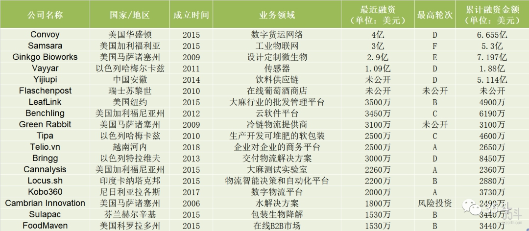 表:2019年农业食品供应链领域融资最高的20起交易背后的公司数据