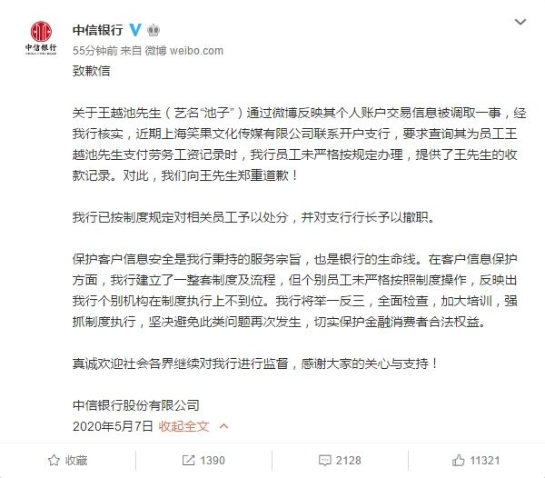 关于王越池先生(艺名“池子”)通过微博反映其个人账户交易信息被调取一事,经我行核实,近期上海笑果文化传媒有限公司联系开户支行,要求查询其为员工王越池先生支付劳务工资记录时,我行员工未严格按规定办理,提供了王先生的收款记录。对此,我们向王先生郑重道歉!