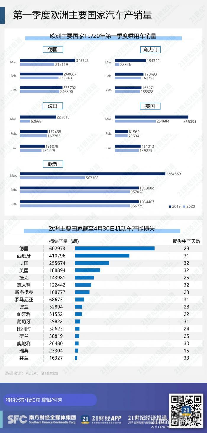 根据欧洲汽车制造商协会ACEA近日公布的数据,欧盟28国(含英国)3月的乘用车销量同比下跌了45%,仅为56.7万辆。根据安永的预估,在经济生活受到最严重影响的4月,欧盟各国的乘用车销量同比跌幅将达70%,该数字也与中国在疫情最严重的2月同比79%的跌幅大致吻合。