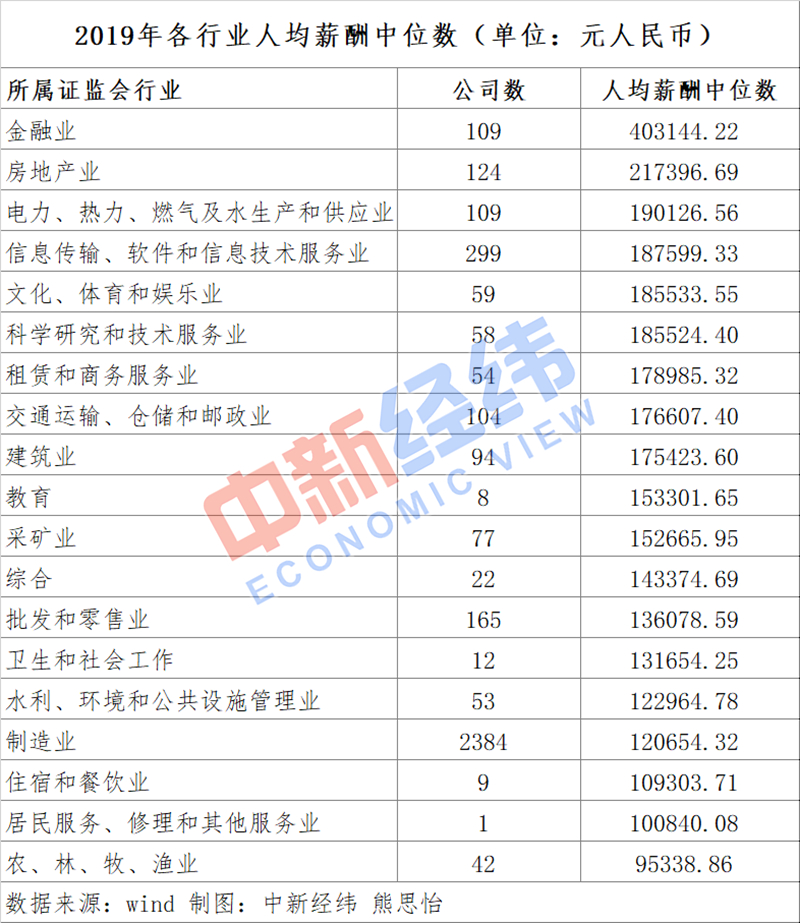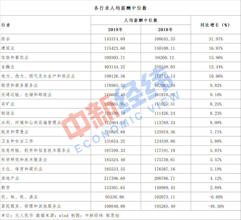 数据显示,金融业最能“造富”,2019年人均薪酬中位数超40万元,房地产业超21万元。相较之下,农林牧渔业人均薪酬最少,中位数仅为9.53万元,住宿和餐饮业及居民服务、修理和其他服务业人均薪酬中位数低于12万元。