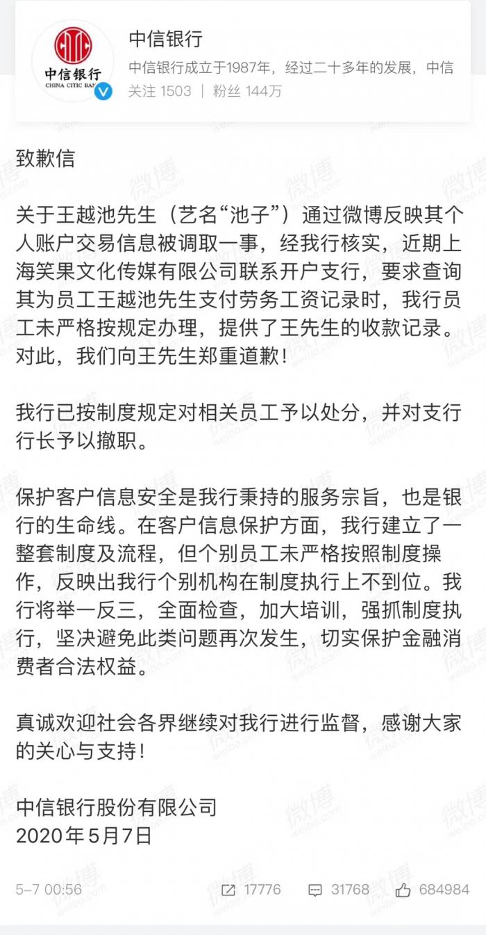 5月7日凌晨,中信银行在官方微博上发布致歉信称,“经我行核实,近期上海笑果文化传媒有限公司联系开户支行,要求查询其为员工王越池先生支付劳务工资记录时,我行员工未严格按规定办理,提供了王先生的收款记录。对此,我们向王先生郑重道歉!”