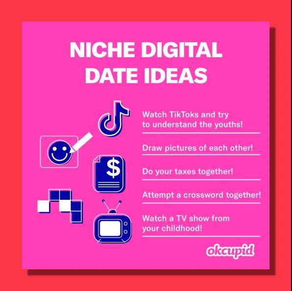 人们的约会开始变得更有创意。沙里坦表示,通过用户关于新冠问题的100万个回复,OkCupid集合了大家贡献的灵感,发布了一系列远程约会建议。这些“居家远程约会”的灵感包括:一起创建音乐播放列表、玩填字游戏、在YouTube上观看一场经典音乐会、为对方画肖像、一起报税,以及看Tiktok试着了解年轻人。