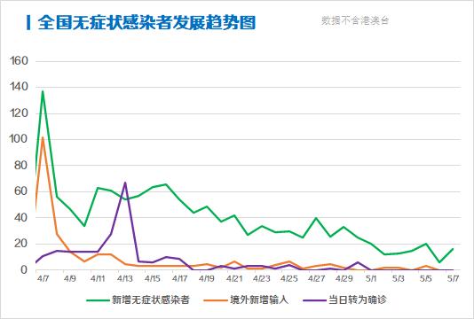 5月7日,全国新增无症状感染者16例,无境外输入病例;无当日转为确诊病例;当日解除医学观察42例(境外输入10例);尚在医学观察无症状感染者854例(境外输入71例)。