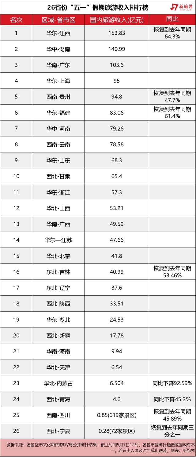 具体到各地,截至5月7日12时,共有28个省份公布本地五一假期旅游数据。先看旅游收入,已经公布旅游数据的省份中,3省份五一旅游总收入均超过100亿元。其中,江西以153.83亿元位列第一,湖南(140.99亿元)、广东(103.6亿元)紧跟其后;