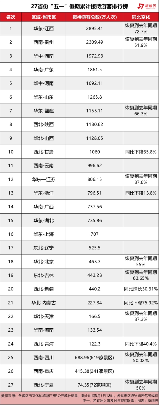 并且5月1日至5日,江西省接待游客人数恢复到去年同期的72.7%,是今年清明假期游客人数的3.1倍;旅游总收入恢复到去年同期的64.3%,是今年清明假期旅游总收入的2.9倍,表现不俗。