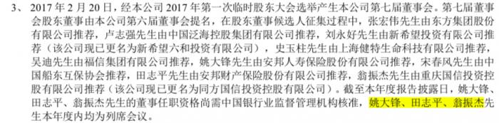 确实如此,民生银行2017年年报备注显示,2017年2月20日,经本公司2017年第一次临时股东大会选举产生本公司第七届董事会。第七届董事会股东董事由本公司第六届董事会提名,在股东董事候选人征集过程中,姚大锋先生由安邦人寿保险股份有限公司推荐,田志平先生由安邦财产保险股份有限公司推荐。