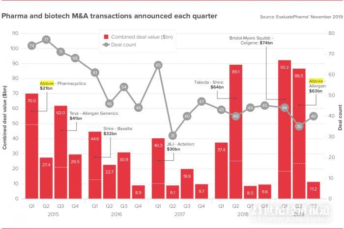 2019年是全球制药企业的交易“大年”。 据EvaluatePharma数据,2019全球制药商在并购交易上花费了2170亿美元,略低于2014年的破纪录水平。