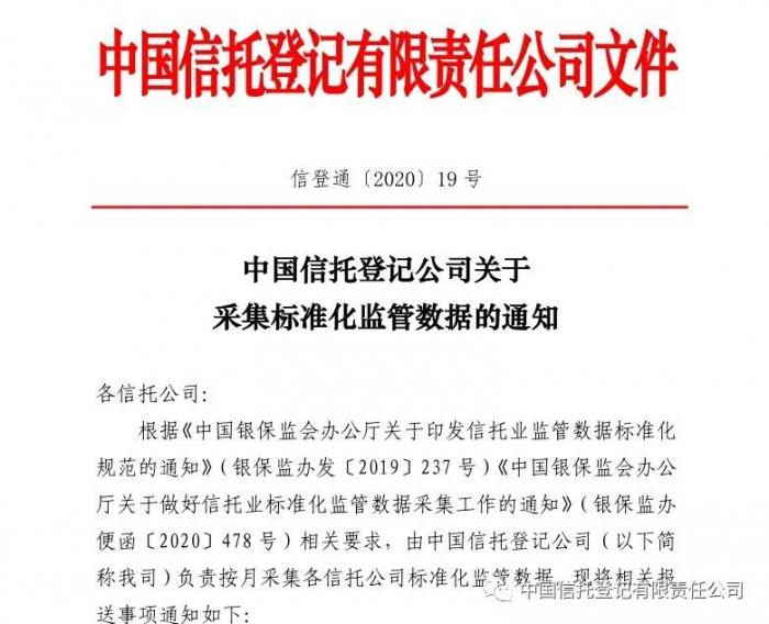 中国信登表示,根据中国银保监会明确由中国信登负责采集管理全国信托业标准化监管数据的监管要求,近期,中国信登向全国各信托公司下发《中国信托登记公司关于采集标准化监管数据的通知》,各信托公司应于每月15日前(遇节假日顺延)将监管数据报送至中国信登,并在今年5月15日前完成首期管理类数据报送工作。