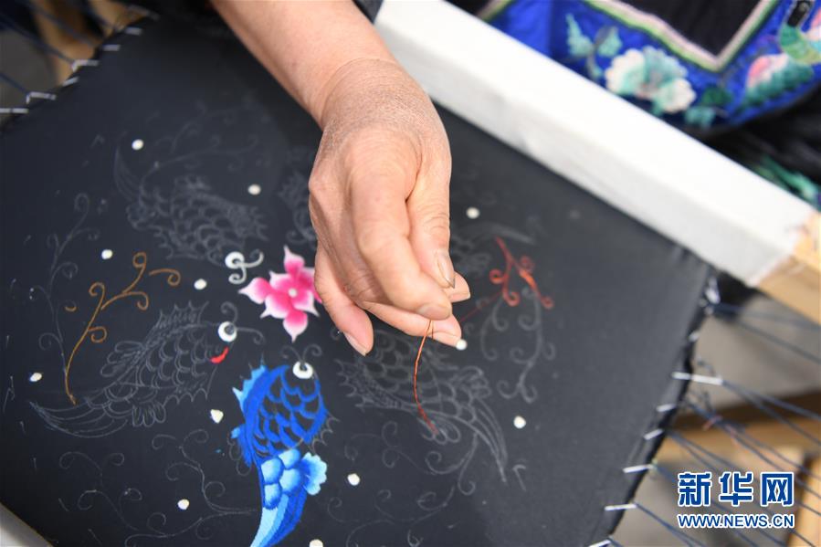吴美金在十八洞村苗绣特产农民专业合作社绣苗绣(4月24日摄)。1967年出生的吴美金,1992年嫁入飞虫村(现十八洞村飞虫寨)时,只有烂泥路的飞虫村不仅田土少,挣钱活路也少,生活十分困难。2014年,吴美金加入了十八洞村苗绣特产农民专业合作社,从小就会的苗绣传统手艺如今成了家庭增收的法宝,不仅在家门口就把钱挣了,同时还能照顾年幼的孙子孙女。“现在的日子,比年轻的时候好多了。”吴美金说。新华社记者 薛宇舸 摄
