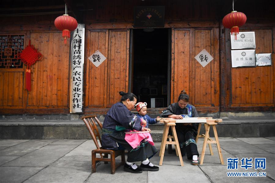吴美金(右一)在十八洞村苗绣特产农民专业合作社绣苗绣(4月24日摄)。1967年出生的吴美金,1992年嫁入飞虫村(现十八洞村飞虫寨)时,只有烂泥路的飞虫村不仅田土少,挣钱活路也少,生活十分困难。2014年,吴美金加入了十八洞村苗绣特产农民专业合作社,从小就会的苗绣传统手艺如今成了家庭增收的法宝,不仅在家门口就把钱挣了,同时还能照顾年幼的孙子孙女。“现在的日子,比年轻的时候好多了。”吴美金说。 新华社记者 薛宇舸 摄