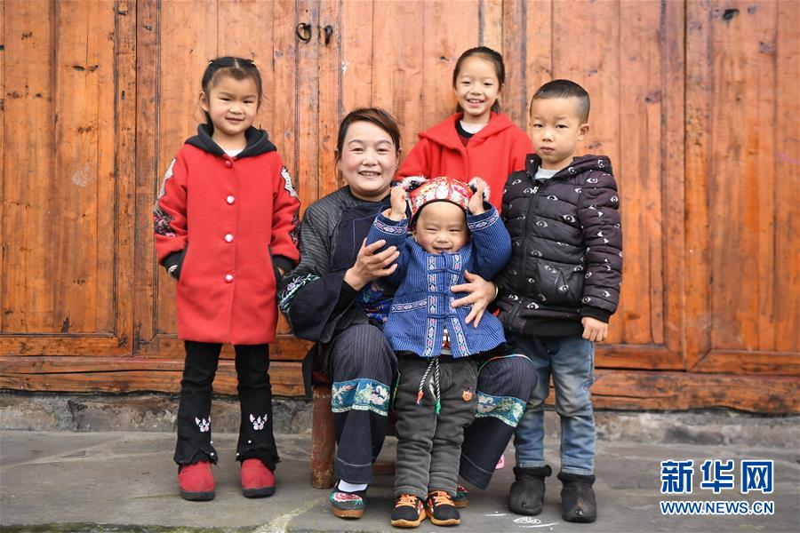 这是4月24日拍摄的吴美金(左二)和她孙子孙女的合影。1967年出生的吴美金,1992年嫁入飞虫村(现十八洞村飞虫寨)时,只有烂泥路的飞虫村不仅田土少,挣钱活路也少,生活十分困难。2014年,吴美金加入了十八洞村苗绣特产农民专业合作社,从小就会的苗绣传统手艺如今成了家庭增收的法宝,不仅在家门口就把钱挣了,同时还能照顾年幼的孙子孙女。“现在的日子,比年轻的时候好多了。”吴美金说。新华社记者 薛宇舸 摄