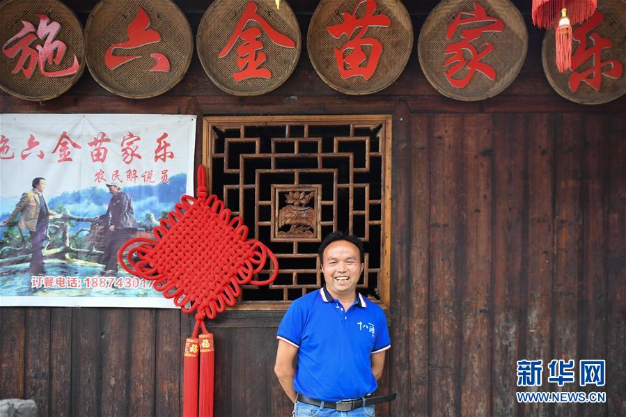 这是施六金在他的农家乐前留影(4月25日摄)。1973年出生于十八洞村的施六金,由于父亲患病很早就放弃学业和母亲扛起了家庭的重担。为了生活,他还曾远去东南亚打工。2015年,看到家乡的变化,施六金回到村里开起了农家乐,年度家庭人均纯收入也从2014年的1715元增长到了2019年的35696元。2018年,施六金与心爱的人组建了家庭。今年初,施六金与爱人迎来了一个大胖小子。“做人做事要懂得回报和感恩。”施六金给刚出生的儿子取名施泽恩。新华社记者 薛宇舸 摄