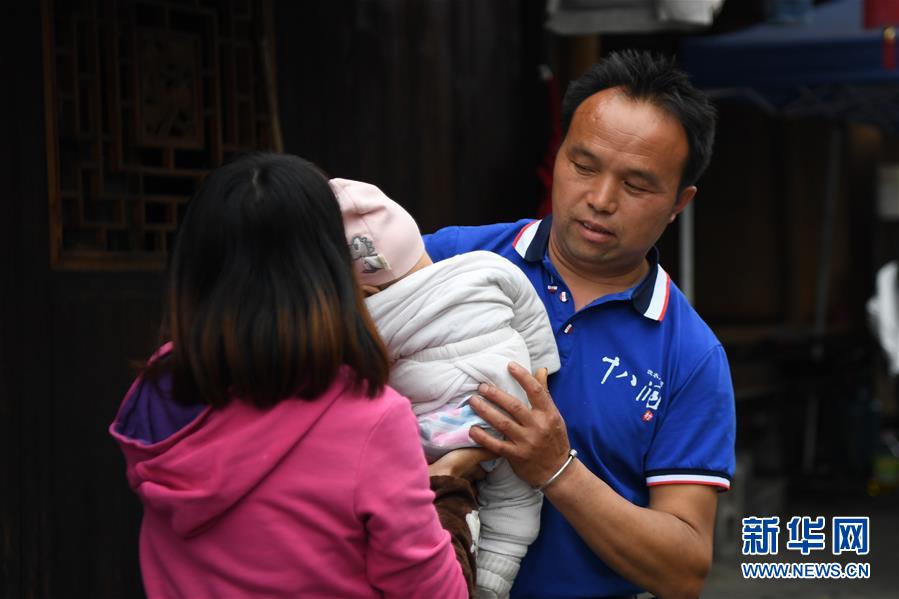 施六金(右)从妻子手中接过儿子施泽恩(4月25日摄)。1973年出生于十八洞村的施六金,由于父亲患病很早就放弃学业和母亲扛起了家庭的重担。为了生活,他还曾远去东南亚打工。2015年,看到家乡的变化,施六金回到村里开起了农家乐,年度家庭人均纯收入也从2014年的1715元增长到了2019年的35696元。2018年,施六金与心爱的人组建了家庭。今年初,施六金与爱人迎来了一个大胖小子。“做人做事要懂得回报和感恩。”施六金给刚出生的儿子取名施泽恩。新华社记者 薛宇舸 摄