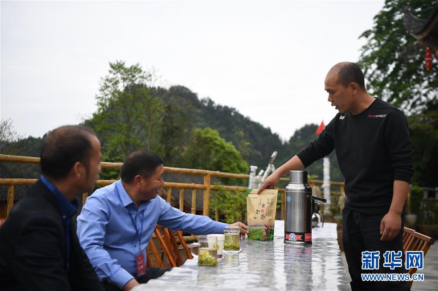 杨正邦(右)在为来自浙江的住客介绍十八洞村种植的“黄金茶”(4月25日摄)。杨正邦1978年出生于十八洞村,在外打工多年。近些年,眼看来十八洞村的游客越来越多,村里越来越热闹,杨正邦在2017年结束自己的打工生涯回乡发展。他先是在村里摆起小吃摊,2018年开起农家乐,去年又搭起新房子扩建成民宿,年度家庭人均纯收入从2014年的1923元增加到2019年的7173元。新华社记者 薛宇舸 摄