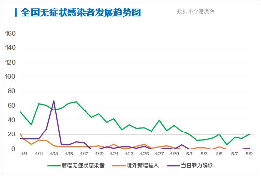 5月9日,全国新增无症状感染者20例,其中境外输入病例1例;当日转为确诊病例1例;当日解除医学观察61例(境外输入16例);尚在医学观察无症状感染者794例(境外输入48例)。