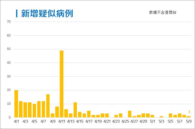 截至5月9日24时,全国现有疑似病例4例,新增疑似病例1例(在内蒙古),为境外输入病例。而湖北现有疑似病例保持为零,已连续55天零新增。