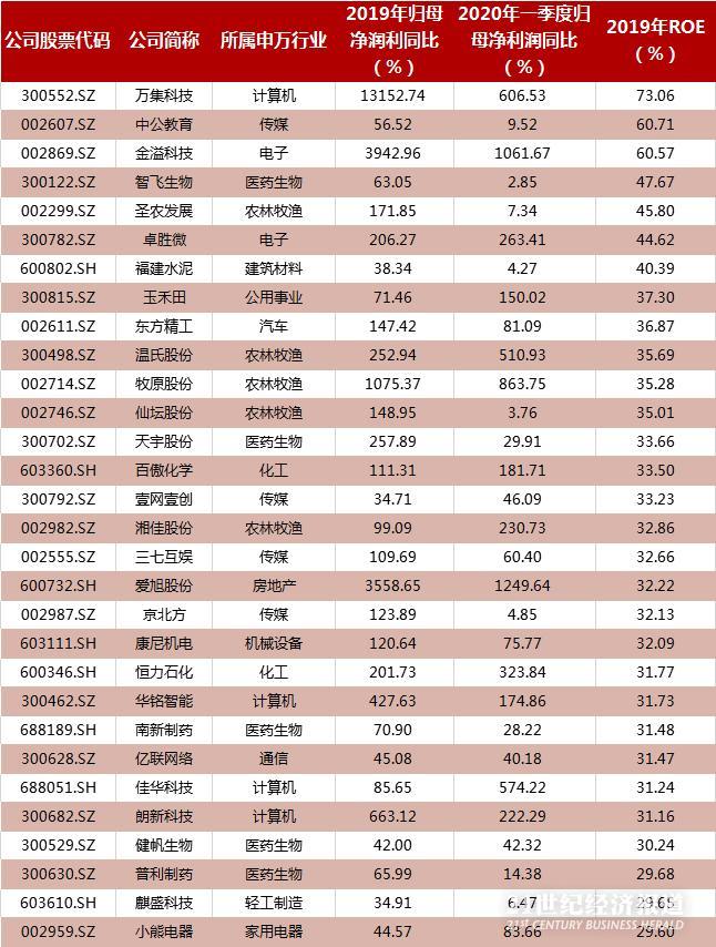 南财AI新闻实验室在剔除ST股后,筛选了2019年净利润增速超过30%,一季度实现盈利的企业,并依据2019年ROE(加权)排序选取了前30家企业以。其中,不乏牧原股份(002714.SZ)、中公教育(002607.SZ)、三七互娱(002555.SZ)此类大市值绩优股,也有万集科技(300522.SZ)、东方精工(002611.SZ)这类市值不足百亿的小公司在内。整体来看,农林牧渔、医药生物、传媒、计算机四个行业的公司相对居多。