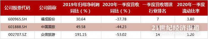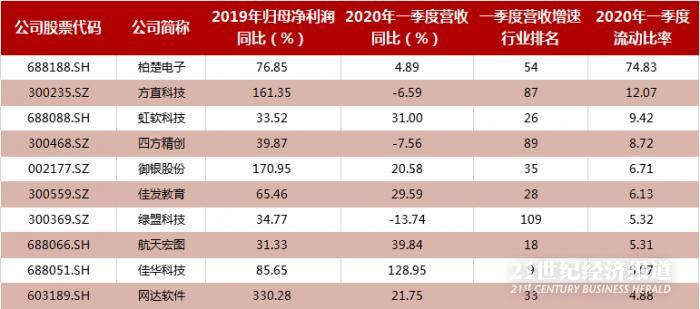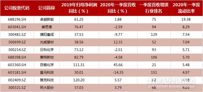 南财AI新闻实验室针对计算机、化工、休闲服务、交通运输四个在一季度中受影响最大的行业进行个股甄别,选取2019年归母净利润增速超过30%,而一季度营收增长超过行业中位数的企业,并根据其一季度的流动比率进行了排序。这些企业由于行业因素,或许需要更长的时间来恢复疫情之前的盈利水平,年内的盈利改善不确定性较大,但其本身具有良好的抗风险能力,有望在疫情过后实现基本面的较快好转。
