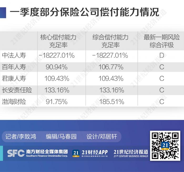 若以此为标准,2020年一季度,中法人寿、百年人寿、君康人寿,以及长安责任险、渤海财险偿付能力不达标。
