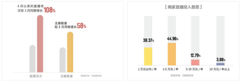 这不,马蜂窝在近日便发布了首份旅游行业直播报告《旅游直播时代——文旅生态洞察2020》(下称“报告”),报告里指出,4月以来马蜂窝平台的直播场次较3月同期增长108%,主播数量较3月同期增长58%;受访商家中,超三成商家表示已经开始直播,绝大部分未开播商家表示未来会开展直播业务……