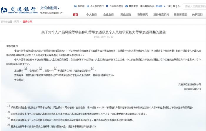 5月12日,交通银行在官网通告称,拟统一调整个人产品风险等级名称和等级表述,以及个人风险承受能力等级表述。这是呈现在每个财富管理客户合同中的内容,银行为何大费周折去改呢?