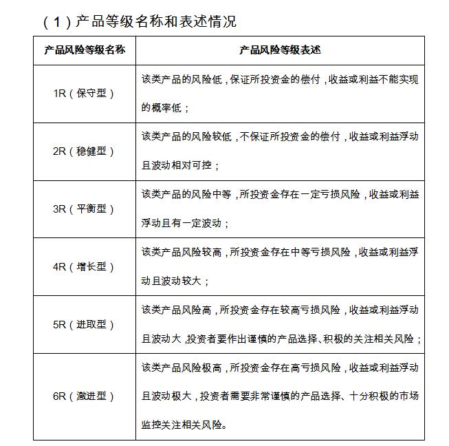 4. 4R表述为“该类产品风险较高,所投资金存在中等亏损风险,收益或利益浮动且波动较大”;老版本是“该类产品风险中等,存在一定的本金亏损风险,预期收益率存在一定的不确定性”。风险又被调高了一个等级。