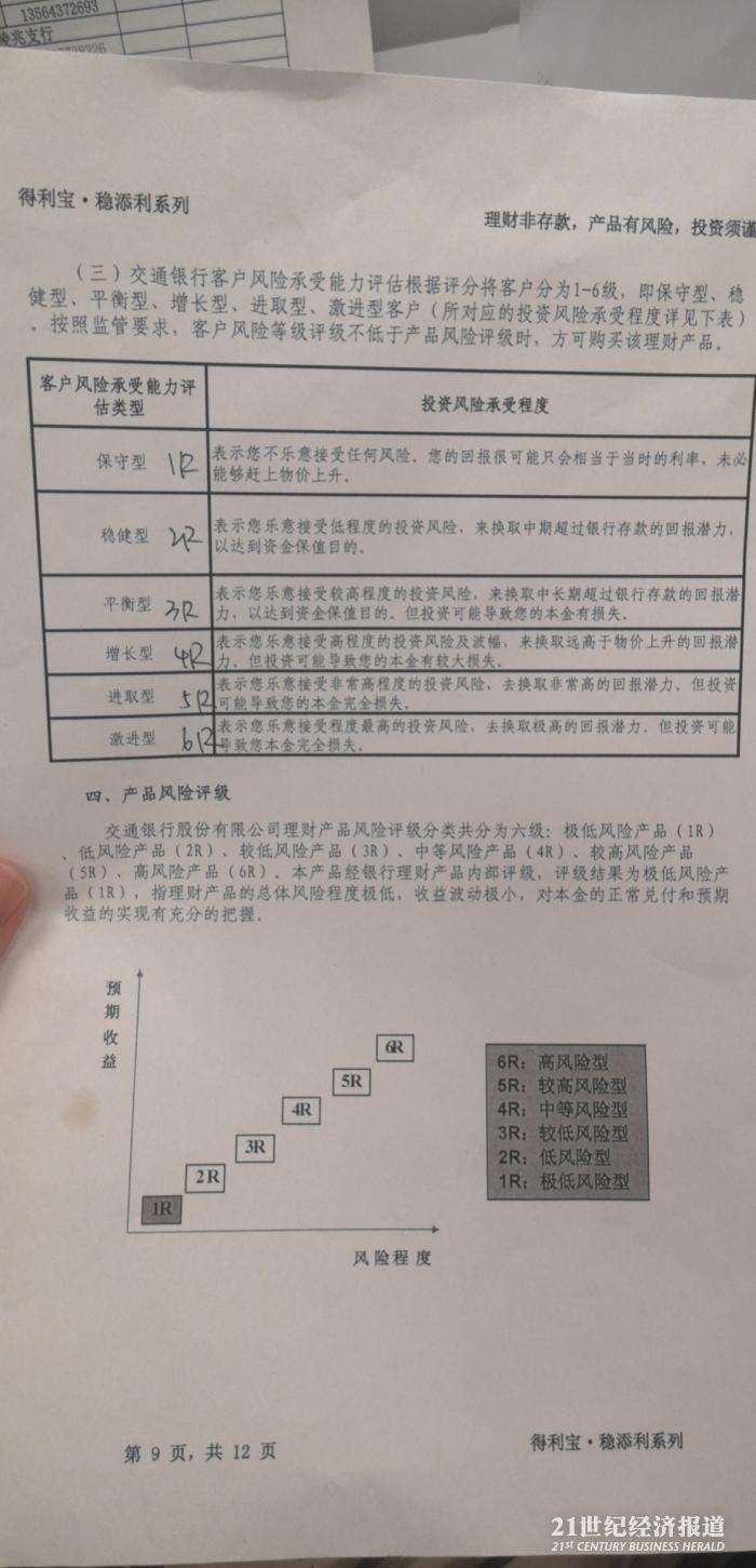 记者获取的一份交行理财产品介绍显示,在调整前交行按照1R、2R、3R、4R、5R、6R的名称来区分产品风险等级。R表示risk,也就是风险,字母前的数字越大风险越高,1R对应极低风险型,2R对应低风险型,3R对应较低风险型,4R对应中等风险型,5R对应较高风险型,6R对应高风险型。不过在最新的调整后,这种偏模糊的表述被改为1R(保守型)、2R(稳健型)、3R(平衡型)、4R(增长型)、5R(进取型)、6R(激进型)。下图为修改后的产品风险等级描述。