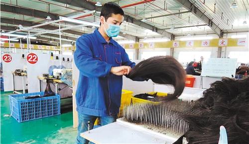 和田森特发制品有限责任公司负责人潘桂芳说:“假发生产是个熟能生巧的劳动密集型产业。经过一年多在岗锻炼,300多名员工计件工资从800元提高到2500元以上。从刚开始不愿干到主动加班增收的工人越来越多了。”