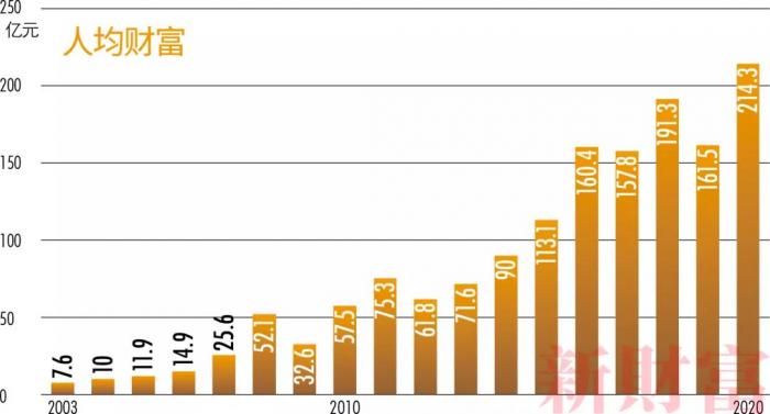 而上榜者的人均财富则从2019年的162亿元升至214亿元,创下历史新高。回到2003年,全中国最富有的人平均财富仅为7.6亿元,17年间,上榜富人平均财富的年化增速高达33%,明显高过同期中国GDP、国民收入的增速。