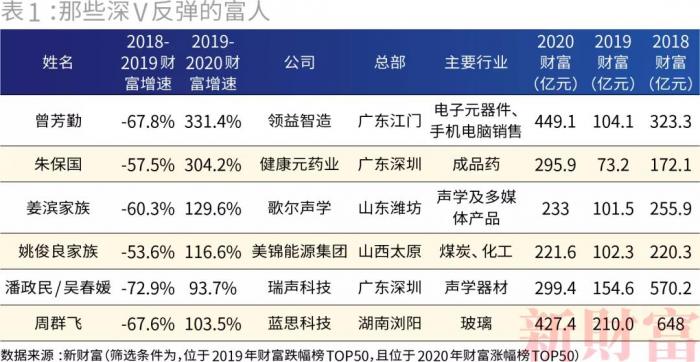领益智造的曾芳勤,2018年财富323亿元,2019年跌至104亿元,今年又快速反弹至449亿元。手机产业链上,蓝思科技周群飞、歌尔声学姜滨家族、瑞声科技潘政民夫妇,都经历着同样的人生起伏。落在榜单上,人们只看到数字没有情感地跳动。但若要深刻去理解这个深V曲线是如何下探与爬升,一定是无数把辛酸泪:产业链上下游的兴衰、外围封锁打压5G、A股的市场情绪等纷繁况味,均在不言中。