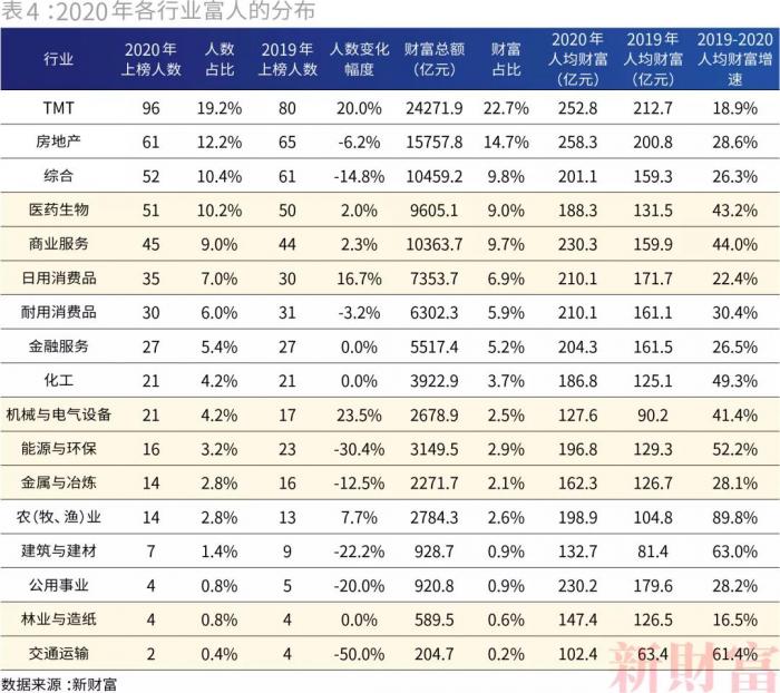 而医药生物和日用消费品行业,则是新财富富人榜一直提示的投资主线。其中医药生物行业富人已达到51人,占比超过10%。其人均财富从132亿元大幅增值188亿元,涨幅43%。