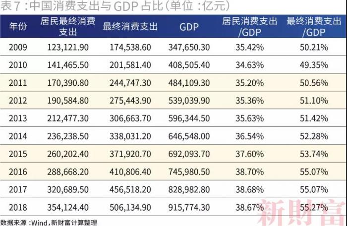 国潮品牌崛起的大背景,是最近十年,中国的消费支出占GDP比重一直在缓步提升(表7)。Wind数据显示,2009-2018年间,中国最终消费支出占GDP的比例从50%提升至55%,已超过半壁江山;而主要增量为家庭消费支出,其占GDP比例从35.4%上升至38.7%。