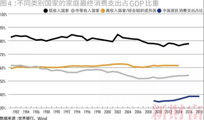 如果对比其他国家情况来看,喜欢高储蓄的中国家庭,消费支出占GDP比例还有望进一步上升。根据世界银行的统计数据,2016年,低收入国家的家庭消费支出占GDP比例为77.83%,中等收入国家为54.27%,而高收入国家则为61.42%(图4)。