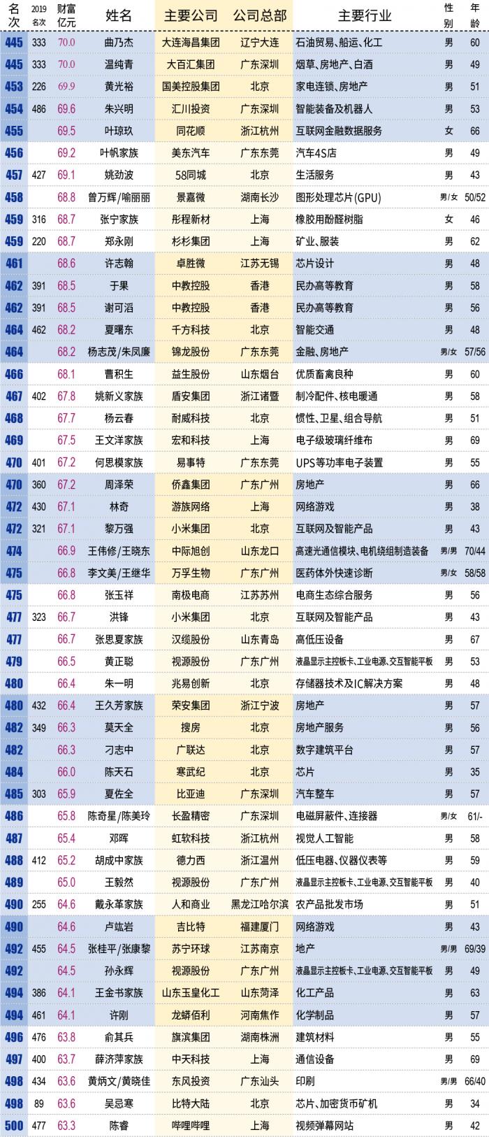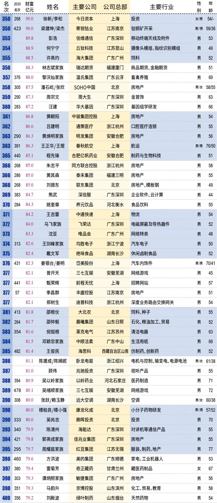 悬于A股的几万亿质押爆仓危机化于无形,扎根于资本市场的富人财富深V反弹。500名上榜者中,身家同比实现上涨或持平的富人高达418名,其中327人同比上涨10%以上,197人同比上涨50%以上。即榜单上6成富人财富上涨超过10%,4成富人财富上涨超过50%。与此同时,只有82名富人同比出现下跌。