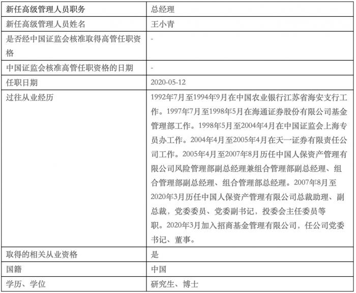 公告的履历显示,王小青1992年7月至1994年9月在中国农业银行江苏省海安支行工作。1997年7月至1998年5月在海通证券股份有限公司基金管理部工作。1998年5月至2004年4月在中国证监会上海专员办工作。2004年4月至2005年4月在天一证券有限责任公司工作。2005年4月至2007年8月历任中国人保资产管理有限公司风险管理部副总经理兼组合管理部副总经理、组合管理部副总经理、组合管理部总经理。2007年8月至2020年3月历任中国人保资产管理有限公司总裁助理、副总裁,党委委员、党委副书记,投委会主任委员等职。2020年3月加入招商基金管理有限公司,任公司党委书记、董事。