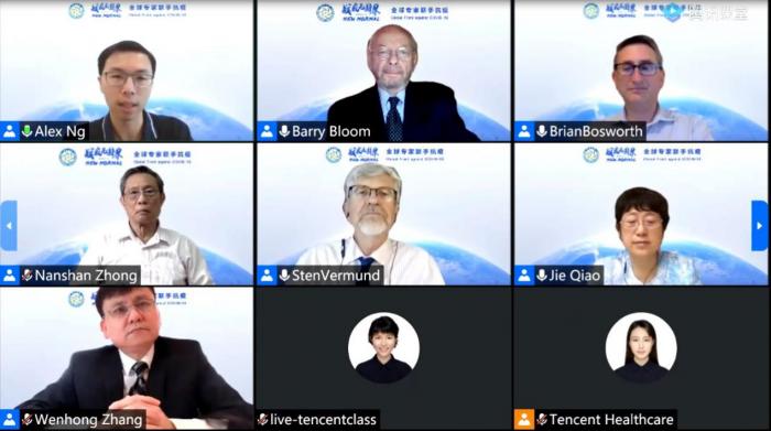 由腾讯医疗副总裁吴文达医生主持“虚拟炉边聊天”,中国工程院院士、国家卫健委高级别专家组组长钟南山,中国工程院院士、北京大学第三医院院长乔杰,上海市新冠肺炎临床救治专家组组长、复旦大学附属华山医院感染科主任张文宏组成的“最硬核中国专家团”,云端对话美国国家科学院院士、哈佛大学公共卫生学院教授、前哈佛大学公共卫生学院院长Barry R. Bloom教授,耶鲁大学公共卫生学院院长、耶鲁大学公共卫生教授Sten H. Vermund和纽约大学朗格尼医学中心Tisch医院医学主任Brian P. Bosworth,共同就疫情防控经验,及如何为疫情新常态做好准备等进行了深入探讨。全球近8000名医学界专业人士,通过腾讯会议、腾讯课堂及社交平台参加了交流。