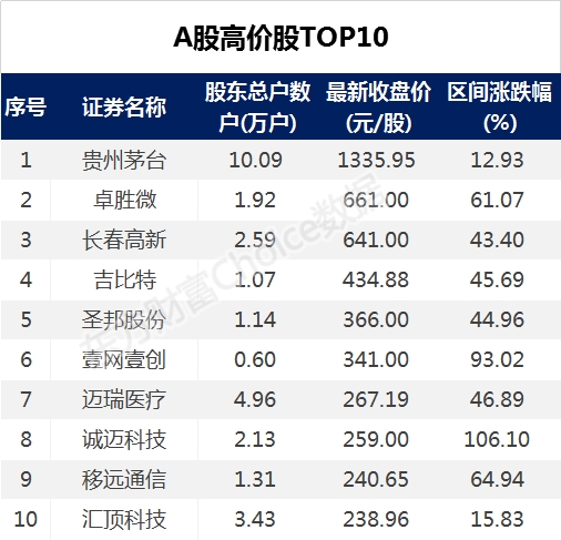 东方财富Choice数据显示,截至5月13日收盘,贵州茅台、卓胜微等10只个股收盘价位列A股前十。