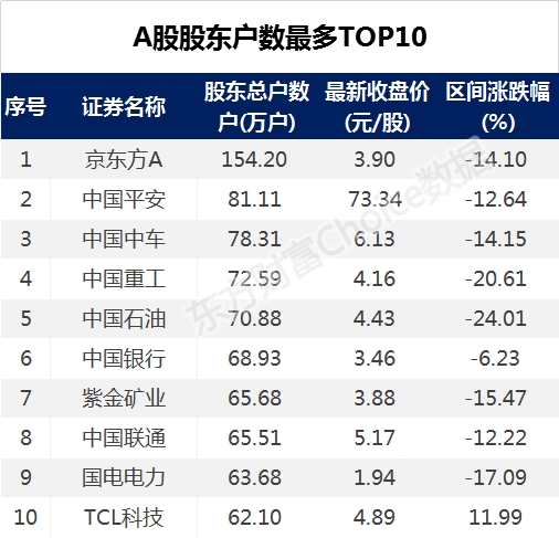 其中京东方A散户数量超150万人,中国平安、中国中车、中国重工、中国石油等股东户数也超70万人,而最低的TCL科技股东户数也超60万人。