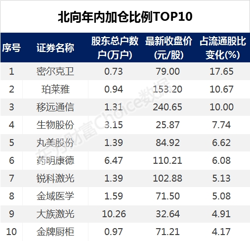 其中密尔克卫、珀莱雅、移远通信等更是获得北向资金“举牌式”加仓,加仓比例均超10%。