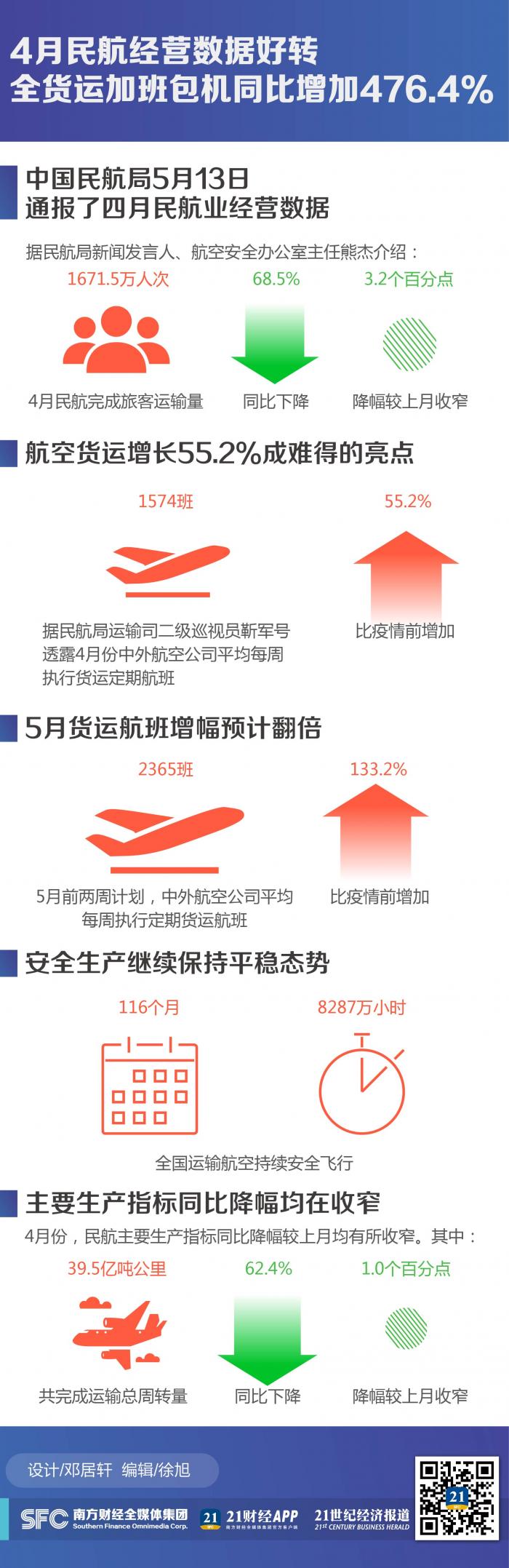 中国民航局5月13日通报了四月民航业经营数据,据民航局新闻发言人、航空安全办公室主任熊杰介绍,4月民航完成旅客运输量1671.5万人次,同比下降68.5%,降幅较上月收窄3.2个百分点。而货运数据增长则成了难得的亮点,据民航局运输司二级巡视员靳军号透露4月份中外航空公司平均每周执行货运定期航班1574班,比疫情前增加55.2%。五月的增速会更快,5月前两周计划,中外航空公司平均每周执行定期货运航班2365班,比疫情前增加133.2%。