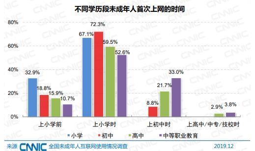 互联网对于低龄群体的渗透能力日渐增强,越来越多的未成年人在学龄前就开始使用互联网。调查显示,高中和中职学生首次使用互联网在学龄前的比例为 15.9%和 10.7%,初中生增长至 18.8%,小学生首次使用互联网在学龄前的比例最高,达到 32.9%。
