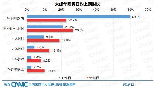 未成年网民工作日日均上网时长在 2 小时以上的为 9.9%,节假日日均上网时长在 5 小时以上的为 10.4%。