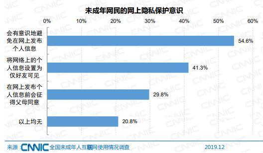 调查显示,54.6%的未成年网民会有意识避免在网上发布个人信息;但是也有 20.8%的未成年网民不具备任何隐私保护意识。