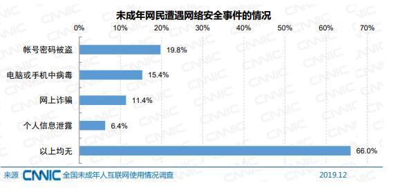未成年网民中对网络权益维护或举报具有一定认知的比例为 75.3%。 未成年网民中过去半年内未遭遇过各类网络安全事件的比例为 66.0%。
