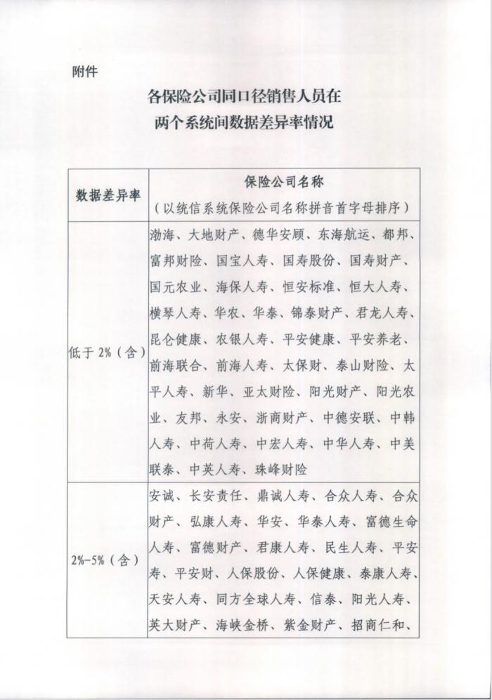 截至2019年底,中介系统、统信系统代理制销售人员同口径数据差异率情况如下:差异率超过20%的保险公司共36家,具体是:安达保险、安盛天平、安华农业、北大方正人寿、长江财产、诚泰财产、出口信用、大家人寿、大家财险、鼎和财产、复星联合健康、国泰财产、和谐健康、和泰人寿、恒邦财产、华海财产、华贵人寿、黄河财险、建信财产、交银康联、利安人寿、美亚、日本兴亚、融盛财险、瑞泰人寿、瑞华健康、三井住友、三峡人寿、三星、太平科技、现代财产、招商信诺、中路财产、中融人寿、中银保险。